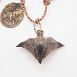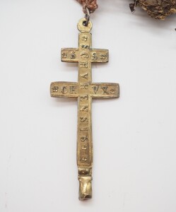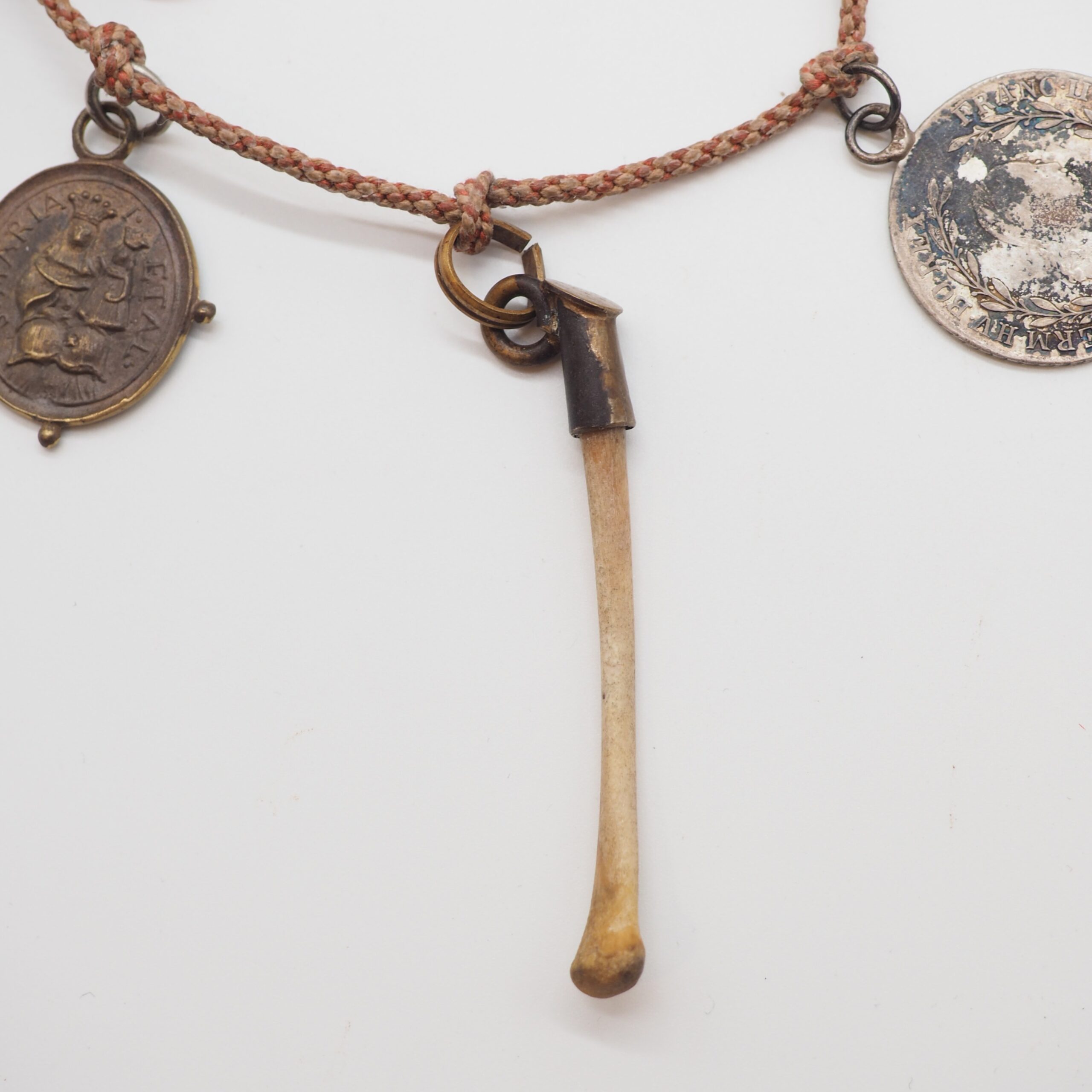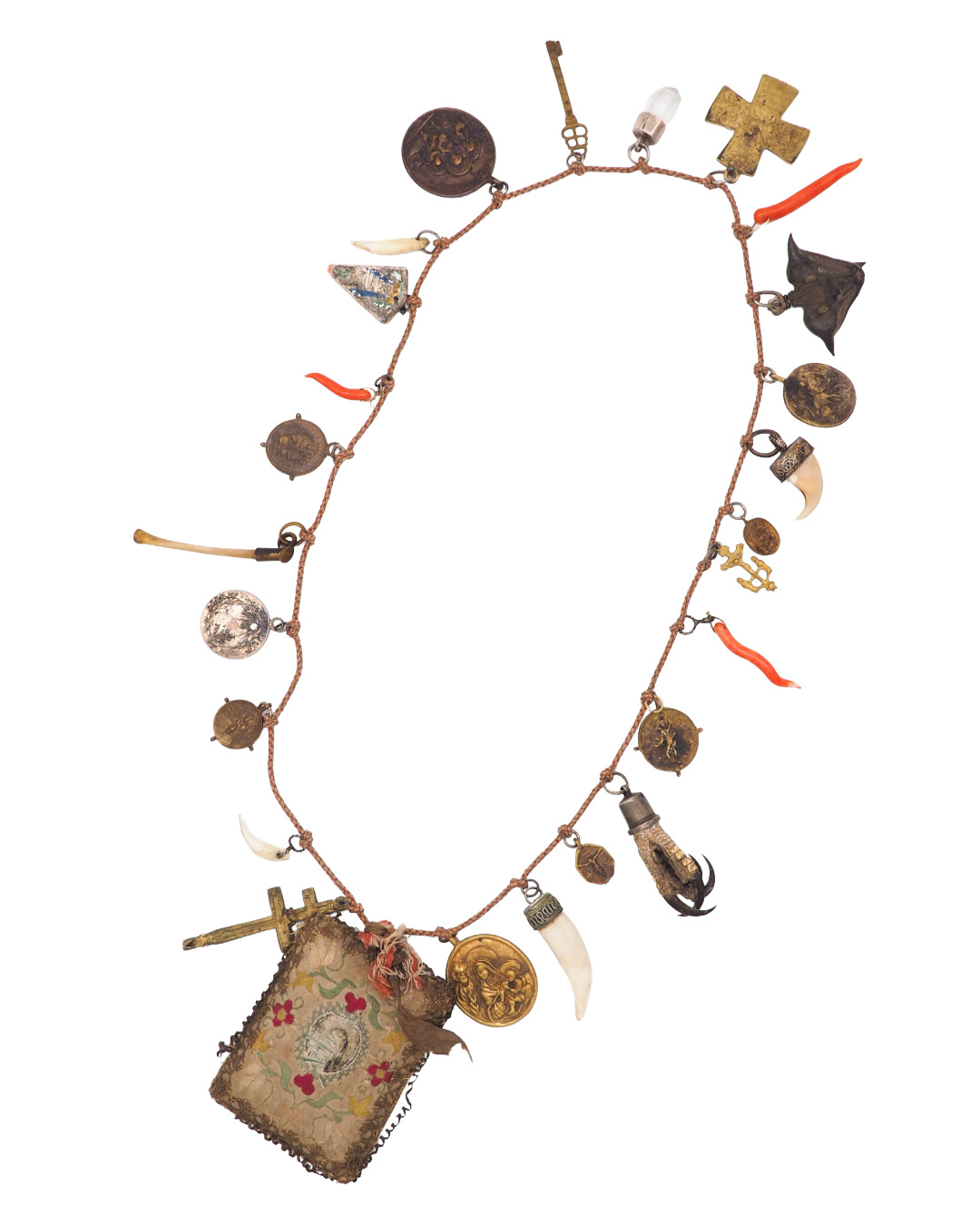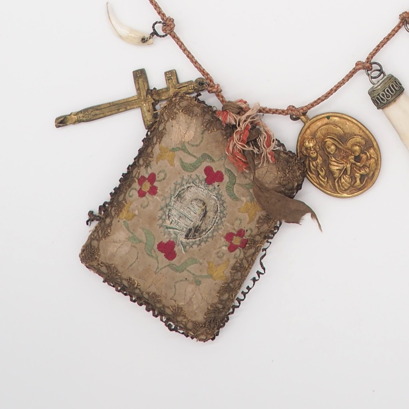 Amulettketten wie Fraisen- oder sogenannte „Tschatschketten“[4] waren im österreichischen und süddeutschen Raum weit verbreitet. Durch verschiedene Amulette und christliche Segenszeichen boten sie in der Vorstellung der Volksmedizin einen kumulativen Schutz gegen Gefahren wie Krankheiten, den bösen Blick, Unglück oder Verhexungen. Sie wurden meistens Kindern ans Bett oder um den Hals gehängt (Abb. 2). Üblicherweise wurde an einer roten Schnur eine ungerade Anzahl an Amuletten angebracht. An der Fraisenkette der Schell Collection befinden sich allerdings 26 Anhänger, es ist zu vermuten, dass das Breverl nachträglich angebracht wurde. Eine andere Art der Fraisenkette wurde aus den Wirbelknochen von Schlangen gefertigt. Die windenden Bewegungen der Tiere ähnelten den epileptischen Zuckungen, daher wurden sie bei diesen als hilfreich angesehen.[5]