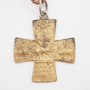 Das Ulrichskreuz ist dem Pectorale[7] des Heiligen Ulrichs von Augsburg nachempfunden. Es zeigt auf der Vorderseite die Schlacht auf dem Lechfeld im Jahr 955, an deren Erfolg er als Bischof beteiligt gewesen sein soll. Die Segenskraft wurde verstärkt durch die Einprägung eines Segensspruches auf der Rückseite zum Schutz vor Dämonen, bzw. einer Darstellung des Hl. Ulrich zwischen dem Hl. Sebastian und dem Hl. Rochus zum Schutz vor der Pest. Die Landbevölkerung sah es als Mittel gegen Mäusefraß und Wetterschäden.[8]