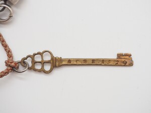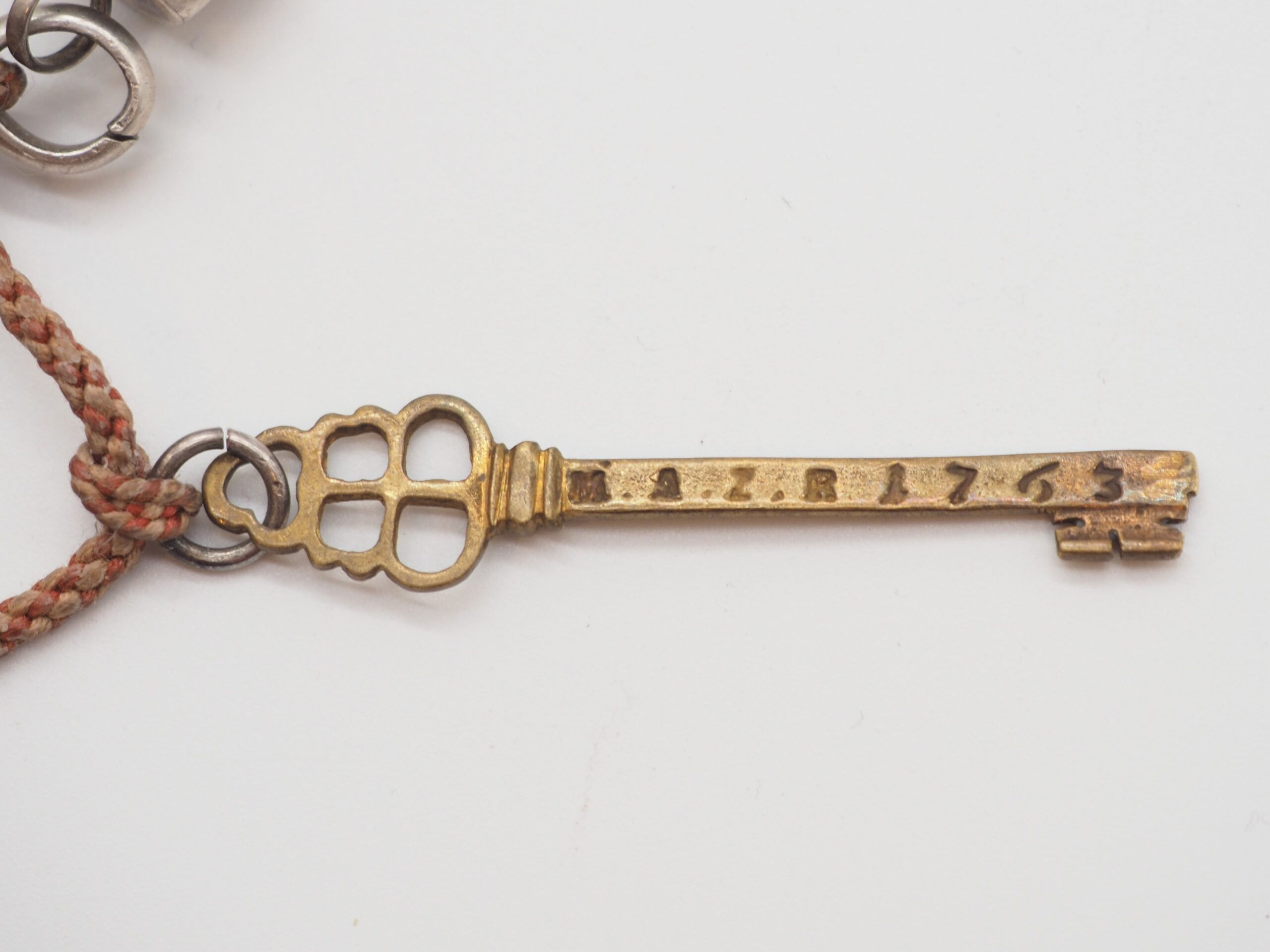 Werfen wir nun einen genaueren Blick auf den Gnadenschlüssel: Es handelt sich um ein flaches Schlüsselchen, wohl aus Messing gefertigt und ungefähr 5 cm lang. Die Reide ist vierfach durchbrochen, mit einem eingestellten Kreuz und darüber einem angedeuteten Dreipass. Das Gesenk ist mehrfach abgesetzt und der Schlüsselbart weist auf drei Seiten einen Einschnitt auf. Auf beiden Seiten des Schaftes wurde jeweils eine Abbreviatur mit Jahreszahl eingeschlagen, die Auskunft über die Entstehungszeit des Schlüsselchens gibt. Auf der Vorderseite (Avers) ist die Inschrift „M.A.Z.R. 1763“ zu lesen, auf der Rückseite (Revers) „A.C.E.R. 1129”. Die Bedeutung wird später noch genauer erläutert.