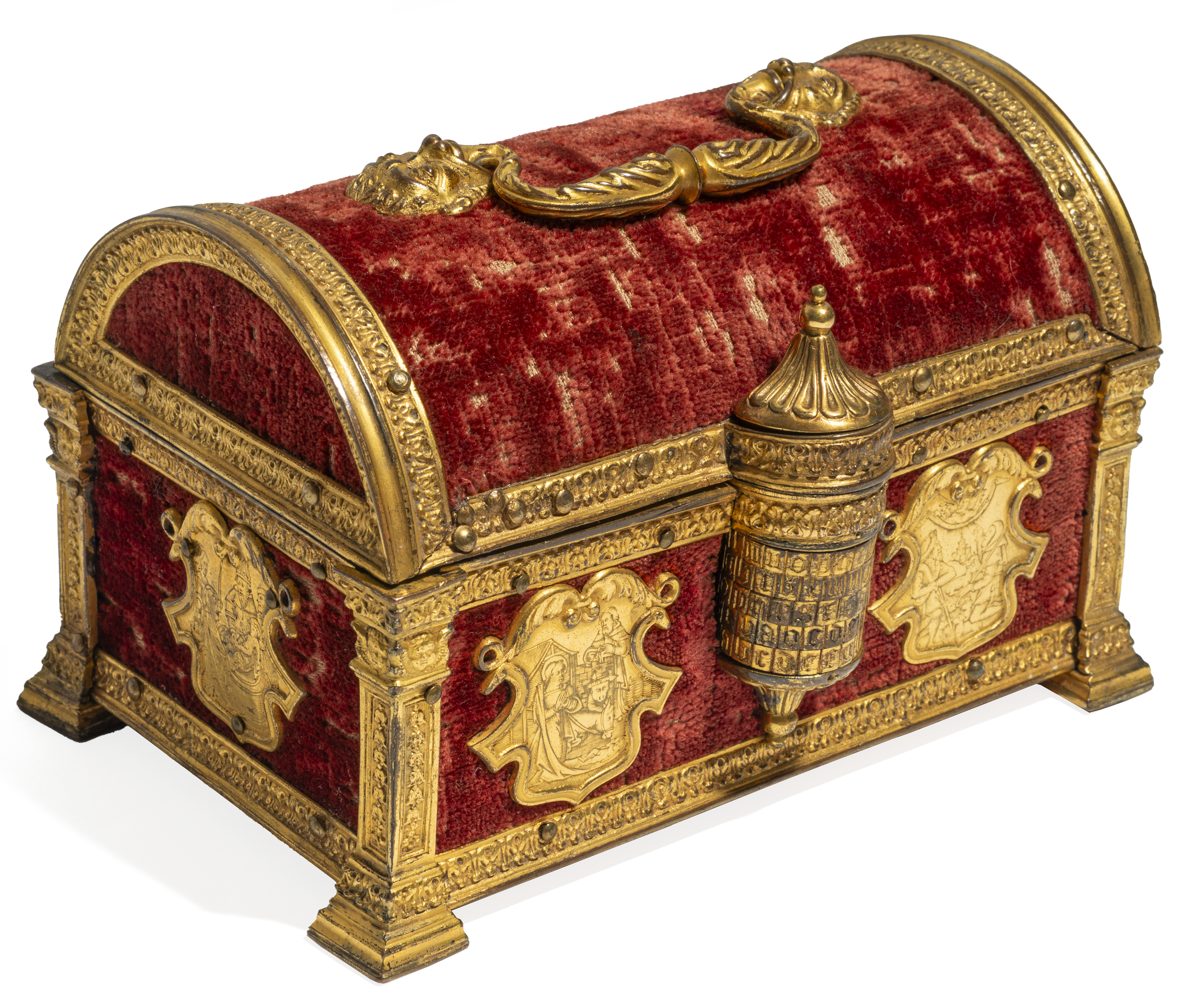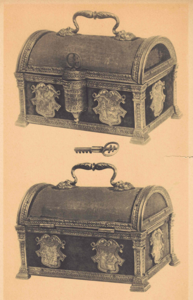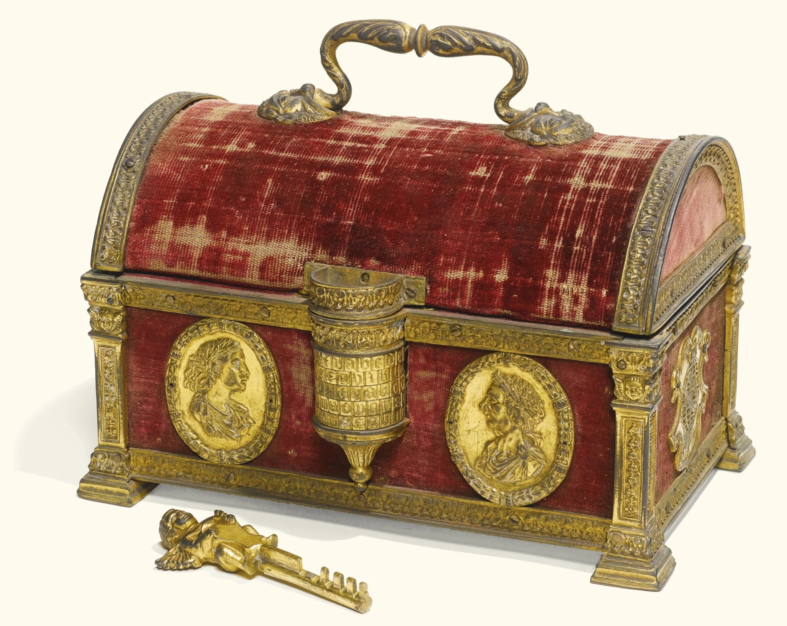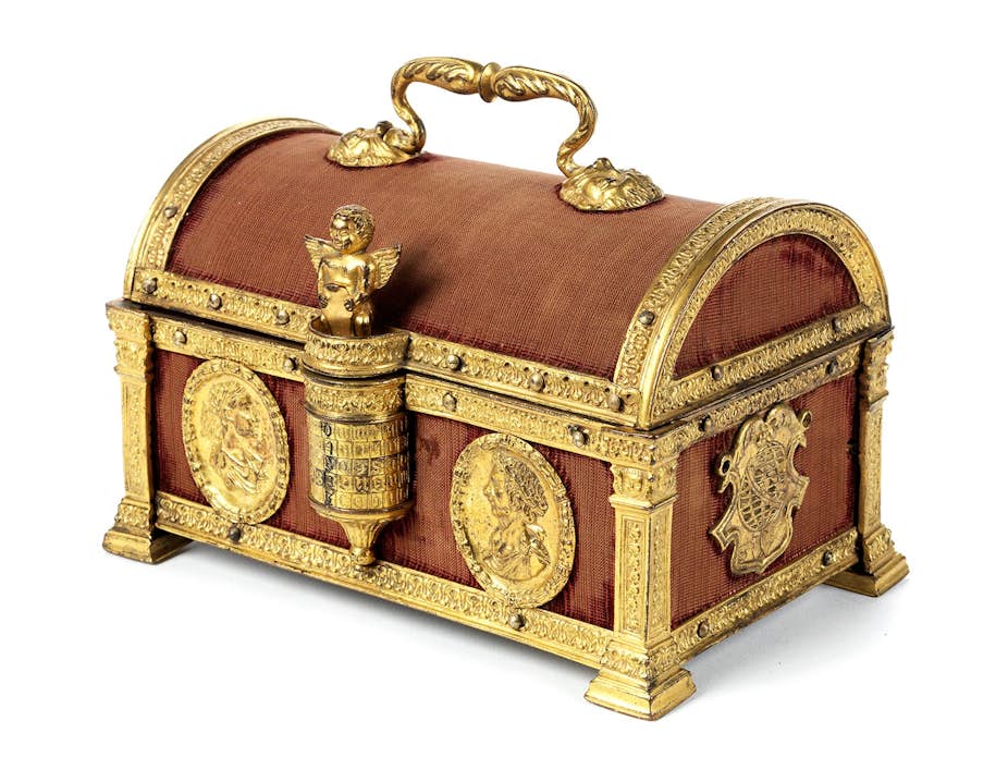 Das in München verkaufte Kästchen hat ebenfalls einen Holzkorpus, der mit Samt bezogen war und inzwischen allerdings zur Gänze abgerieben ist. Der Tragegriff, das Buchstabenkombinationsschloss und die feuervergoldeten Metallbeschläge sind quasi ident zu den Kästchen aus der Schell Collection und dem Musée Le Secq des Tournelles. Über dem Buchstabenkombinationsschloss befindet sich in diesem Fall ein geflügelter Putto, der ein leeres Schild nach vorne gedreht hält. Ein derartiger Putto dürfte ursprünglich auch das Kästchen aus der Schell Collection geziert haben und im Lauf der Jahrhunderte verloren gegangen sein. Er ist mit dem Sperrhebel verbunden, der das Schloss verschließt, bis die richtige Buchstabenkombination eingegeben wird und er herausgezogen werden kann.[19] An Vorder- und Rückseite des Objekts sind in diesem Fall keine christlichen Szenen, sondern Köpfe Römischer Kaiser als Reliefs in feuervergoldeten Medaillons zu sehen. Seitlich sind hier Kartuschen angebracht, die in ihrer Form den Kartuschen des Objekts des Monats ähneln, auf denen allerdings jeweils ein Globus mit zwei Herzen darunter eingraviert worden ist.[20]