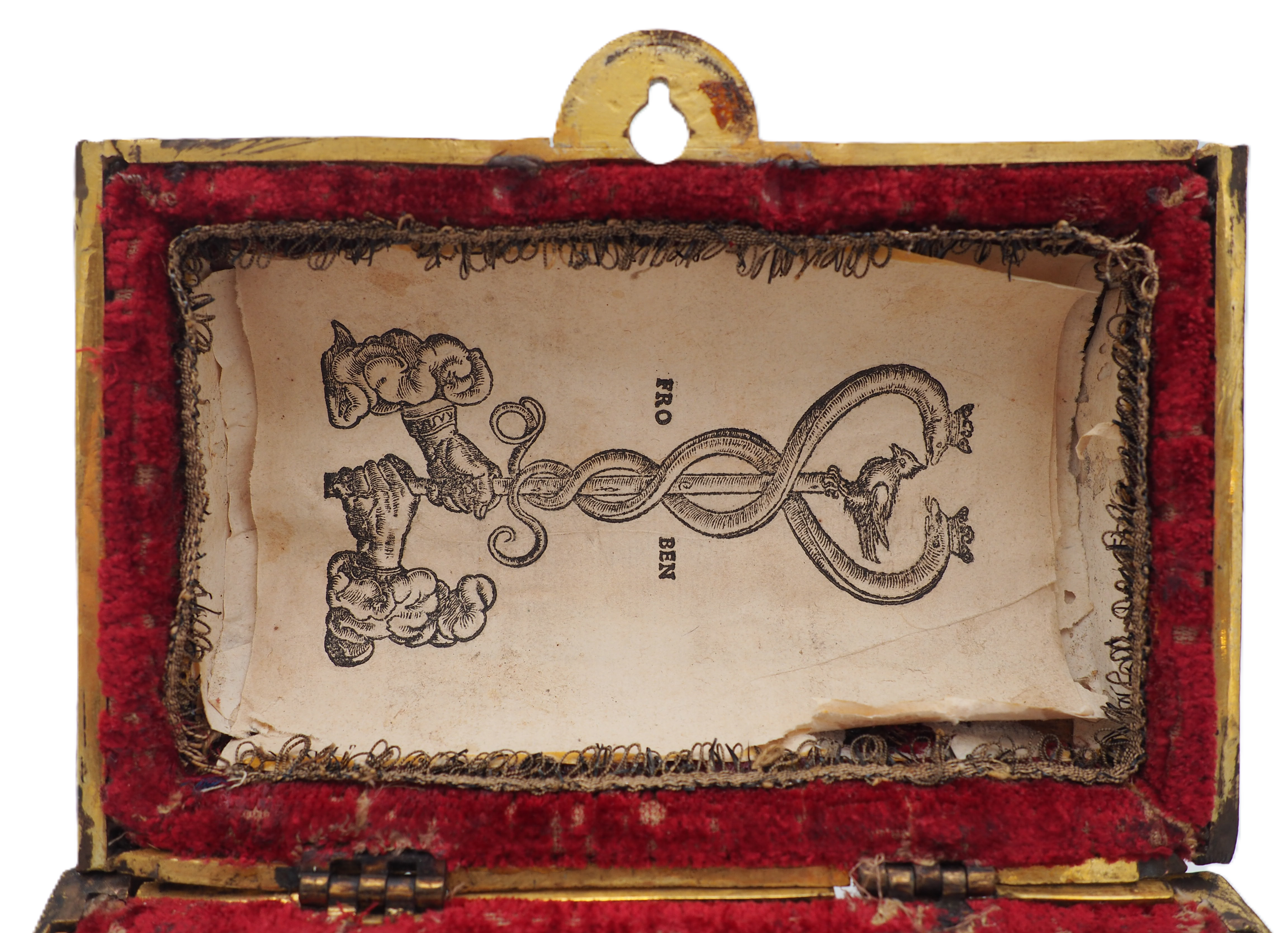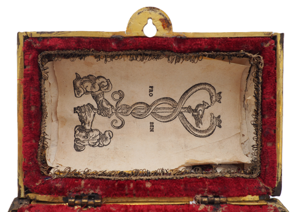 Innen im Kästchen wurde das Siegel eines Buchdruckers auf Papier in den tonnengewölbten Deckel geklebt. Das Siegel gehört zum deutschen Drucker Johann Froben (1460-1527), der auch als Johannes Frobenius bekannt war. Froben stammte ursprünglich aus Hammelburg in Franken, zog aber in den 1480er Jahren in die Schweiz nach Basel, wo er seit 1490 als Buchdrucker belegbar ist. Im Jahr 1491 druckte er eine Bibel als sein erstes eigenständiges Werk. Ab dann sind jährlich Werke von ihm publiziert worden, manchmal auch in Kooperation mit anderen Druckern aus Basel. Ab 1513 spezialisierte er sich allerdings auf humanistische Literatur und druckte nur noch selbstständig. Bekanntheit erlangte er vor allem als ausschließlicher Buchdrucker des Humanisten Erasmus von Rotterdam.[11]