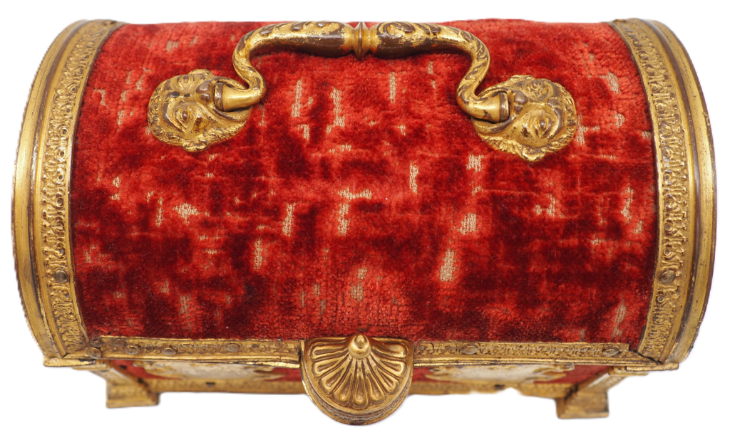 Abb. 18: Detail Kassette „Henri“, Baldachindach mit Samt bezogen und Tragegriff von oben, Frankreich, 16. Jahrhundert. © Schell Collection.