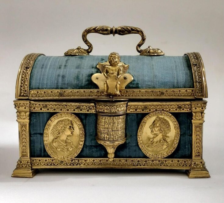 Im Victoria and Albert Museum in England gibt es ebenso ein vergleichbares Kästchen. Dieses Objekt ist überraschend mit blauem statt rotem Samt überzogen. Auch hier ist die Kassette mit feuervergoldeten Metalldetails geschmückt. Wie bei den Vergleichsobjekten, die bei Hampel und Sotheby’s auktioniert wurden, sitzt auch hier ein Putto am Sperrhebel und verschließt das Buchstabenkombinationsschloss. Das Kästchen aus dem V&A ist eines von wenigen, bei dem uns die notwendige Buchstabenkombination bekannt ist – auch hier lautet sie nämlich „henri“. Im Inneren dieses Objekts wurde offenbar eine Notiz gefunden, die auf das 18. Jahrhundert zurückdatiert werden konnte, auf der der Sicherheitscode erklärt wird. Die feuervergoldeten Medaillons an der Vorder- und Rückseite des Objekts scheinen dieselben Römischen Kaiser als Reliefs zu zeigen, wie es bei der Kassette aus der Hampel-Auktion der Fall war. An den beiden Seitenwänden wiederum sind Abbildungen der legendären Lucrezia als Symbol der Tugendhaftigkeit aus der römischen Antike angebracht, die von italienischen Bronzereliefs kopiert worden sind.[22]