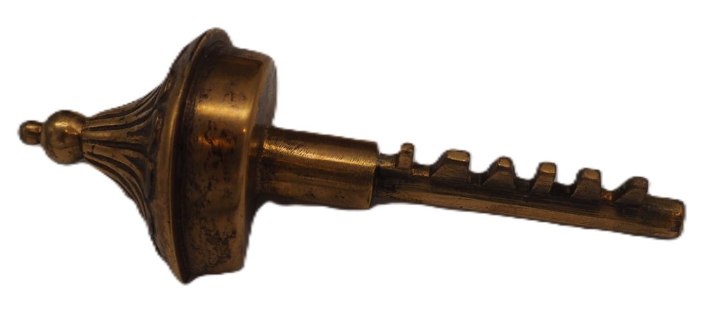 Im Kombinationsschloss steckt von oben eine Art Riegel, der oft auch als Bolzen oder Sperrhebel bezeichnet wird. (Abb. 3) Dieser ist von einem Baldachindach bekrönt und wurde – wie an späterer Stelle beim Vergleich mit ähnlichen Objekten deutlich wird – mit großer Wahrscheinlichkeit nachgemacht. Wenn man den Sperrhebel aus dem Schloss herauszieht und separat betrachtet, erinnert die Form an einen Schlüssel. Er wird durch eine dafür vorgesehene Öffnung im Deckel direkt in das Kombinationsschloss geführt. (Abb. 4) Wenn die Reihenfolge der Buchstaben dann durcheinander gebracht wird, ist das Schloss versperrt. Mehr zur Funktionsweise dieser Sperrmechanismen finden Sie unter dem Punkt Kombinationsschlösser allgemein.